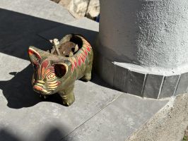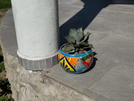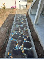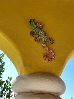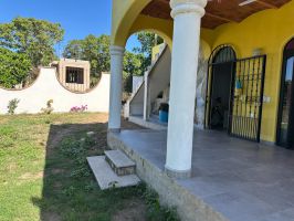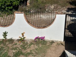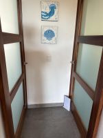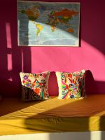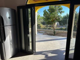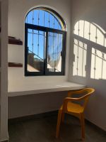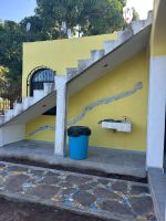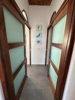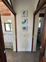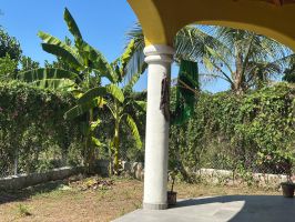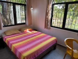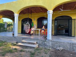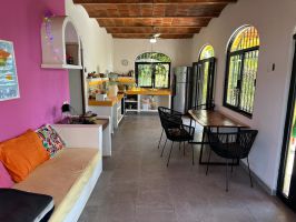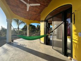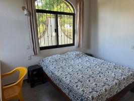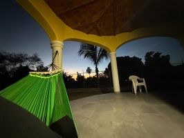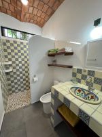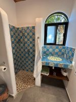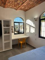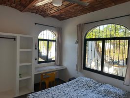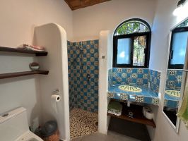 The north and east-facing bedroom is furnished with a double bed (160 x 200 cm) with two separate latex mattresses and has its own integrated bathroom. The bathroom has been lovingly furnished with Mexican tiles and a matching hand-painted washbasin. The windows are fitted with curtains and mosquito screens. The bathroom and bedroom can be closed with sliding doors made of parota wood. The bedroom has a brick-built open wardrobe and a desk.