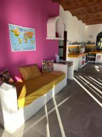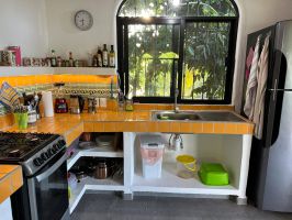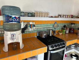 The kitchen, decorated with colorful Mexican tiles, is equipped with a refrigerator with freezer compartment, sink and all kitchen appliances and utensils needed for cooking and eating (including toaster, blender, kettle, French press coffee maker and espresso maker.