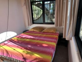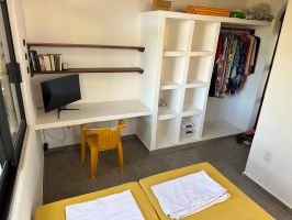 This north and west-facing bedroom is also furnished with a double bed (160 x 200 cm) with two separate latex mattresses, a fixed desk and an open wardrobe with shelves and hanging space. The Mexican-style bathroom is accessible from the corridor. All rooms are fitted with robust sliding doors made of parota wood.