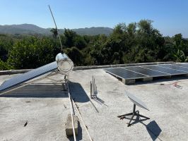 Electricity is provided by six solar panels mounted on the roof and two associated batteries. Service water is drawn from two 5,000-liter cisterns, and drinking water can be obtained from refillable 20-liter bottles in the village.